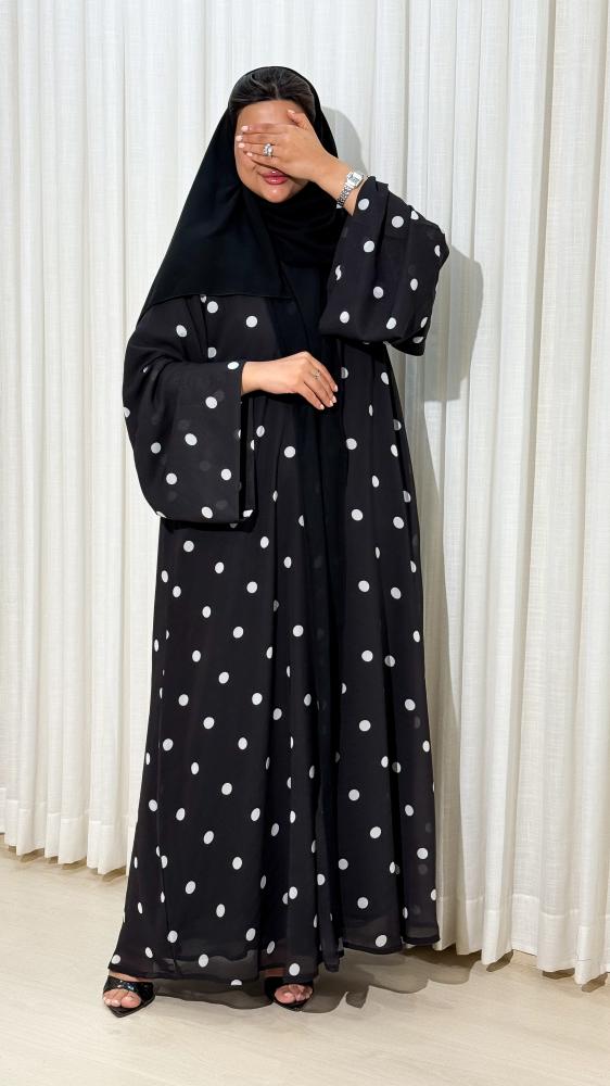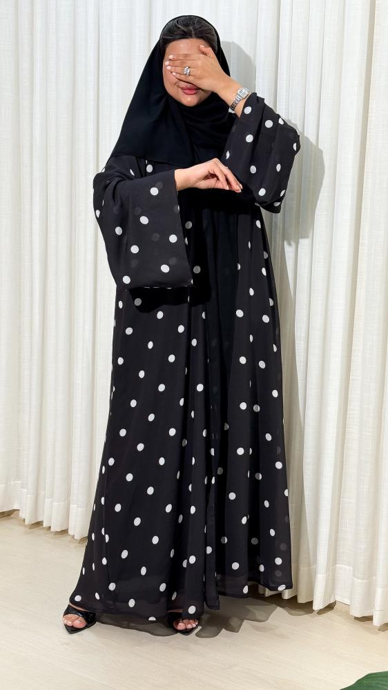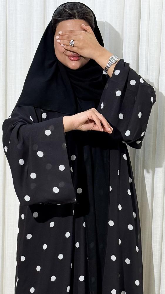 - عباية منقطة اللون الأسود يسهل تنسيقه مع الطرح والإكسسوارات حيث يمنحك اختيارات لا نهائية للإطلالة.